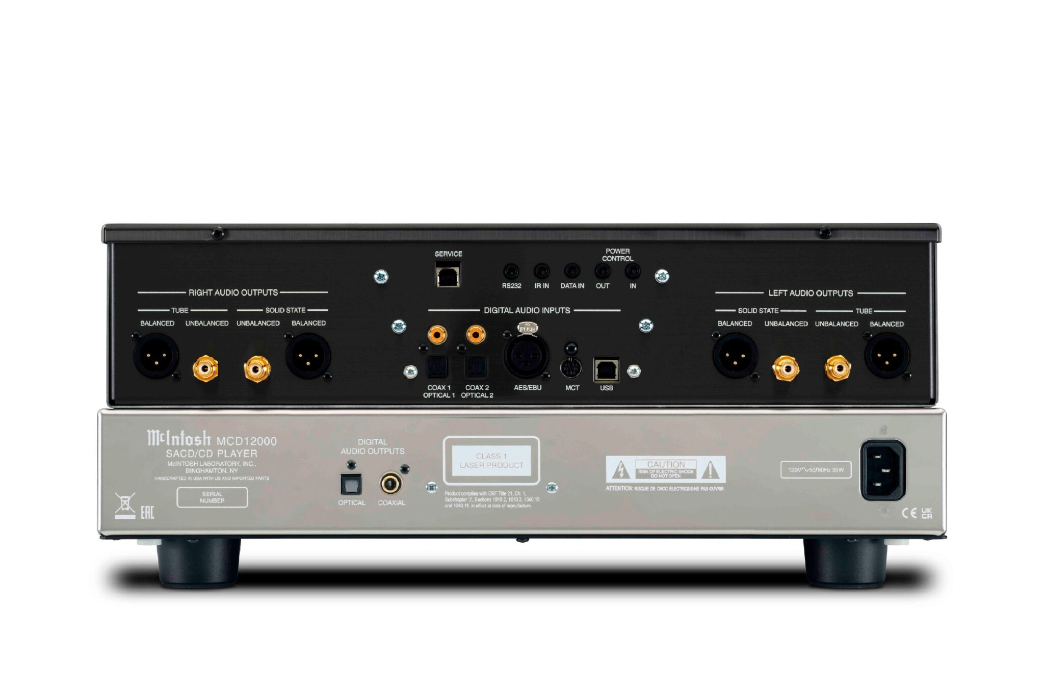 Điểm đặc biệt, MCD12000 có hai đường tín hiệu đầu ra riêng biệt với mạch xuất đèn (Tube Output) sử dụng 12AT7 và 12AX7A, mang lại âm thanh ấm áp, mượt mà, giàu nhạc tính. Và mạch bán dẫn (Solid-State Output) cho âm thanh trong, trung thực, tốc độ và độ động cao. Người dùng có thể lựa chọn giữa hai chất âm này tùy vào gu nghe hoặc phối ghép hệ thống, một điểm độc đáo mà gần như không đầu CD nào khác trong phân khúc có được.